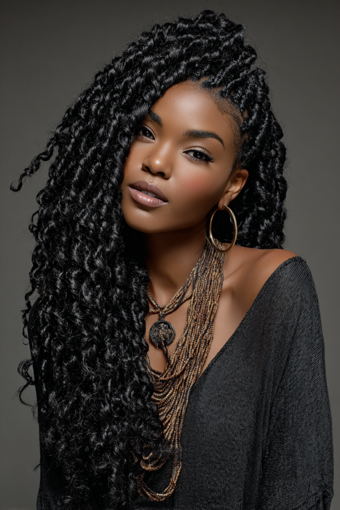 If you want a softer, more romantic look, try passion twists. They are a cross between Senegalese twists and goddess locs.