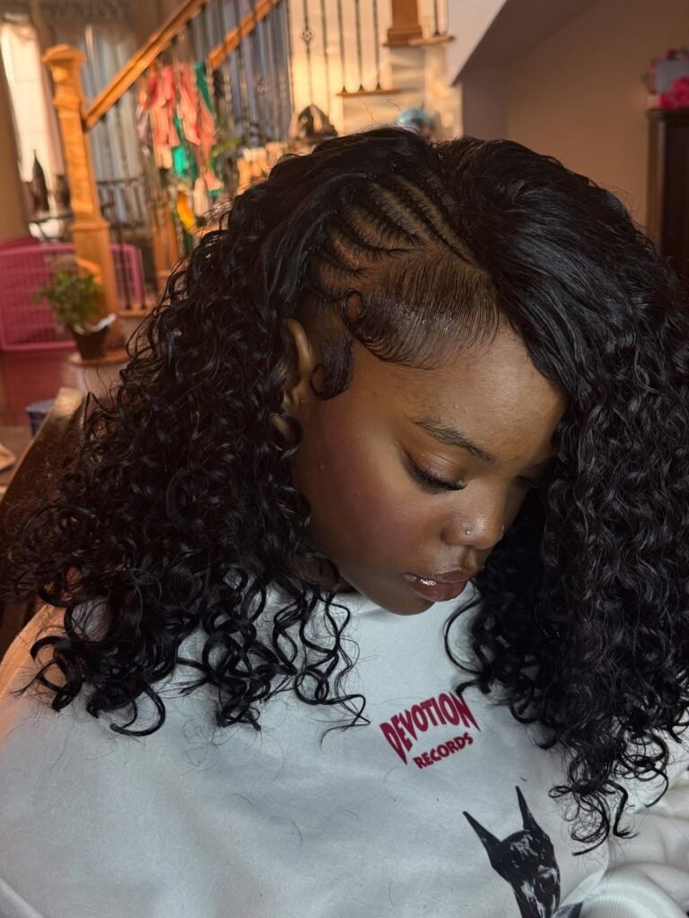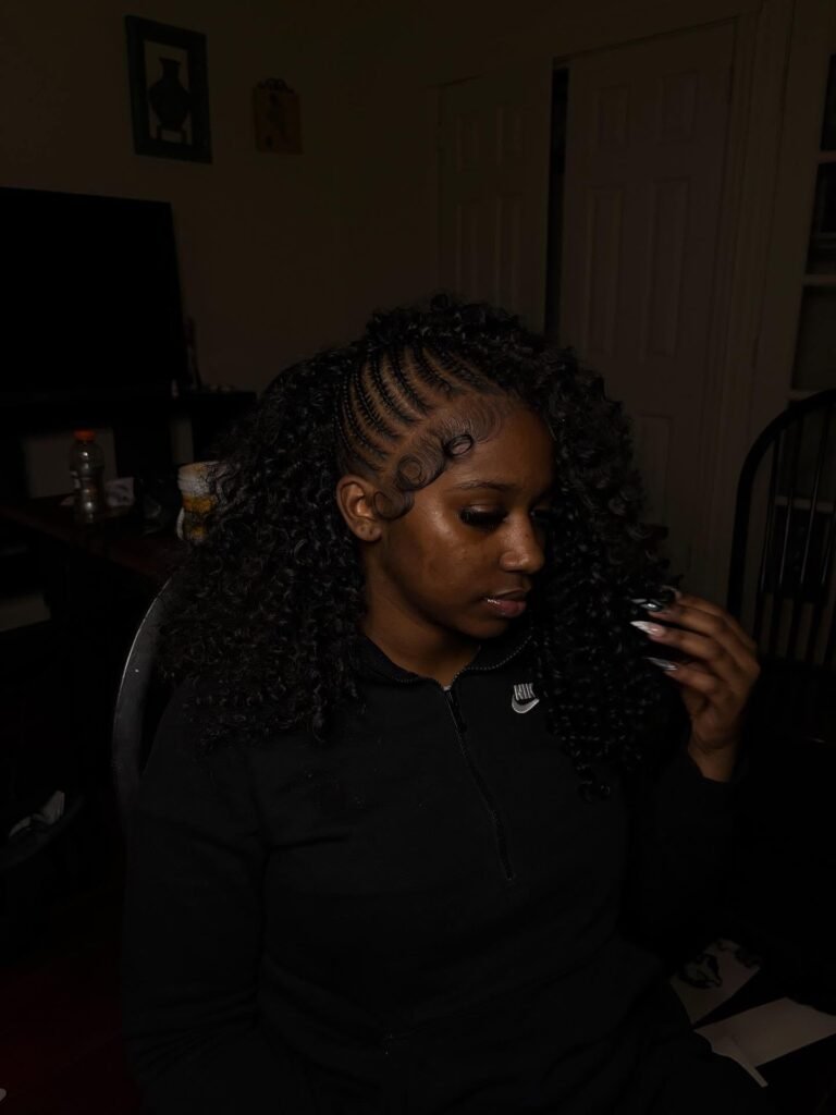 This baby kaylee hairstyle beautifully combines structured braiding with soft, voluminous curls for a balanced and trendy finish. The side cornrow detailing creates a clean foundation, while the defined curls add texture, bounce, and natural movement throughout the style.