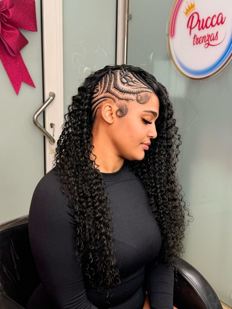 This showstopping combination of intricate scalp artistry and voluminous flowing curls creates an unforgettable, head-turning style perfect for special events and celebrations.