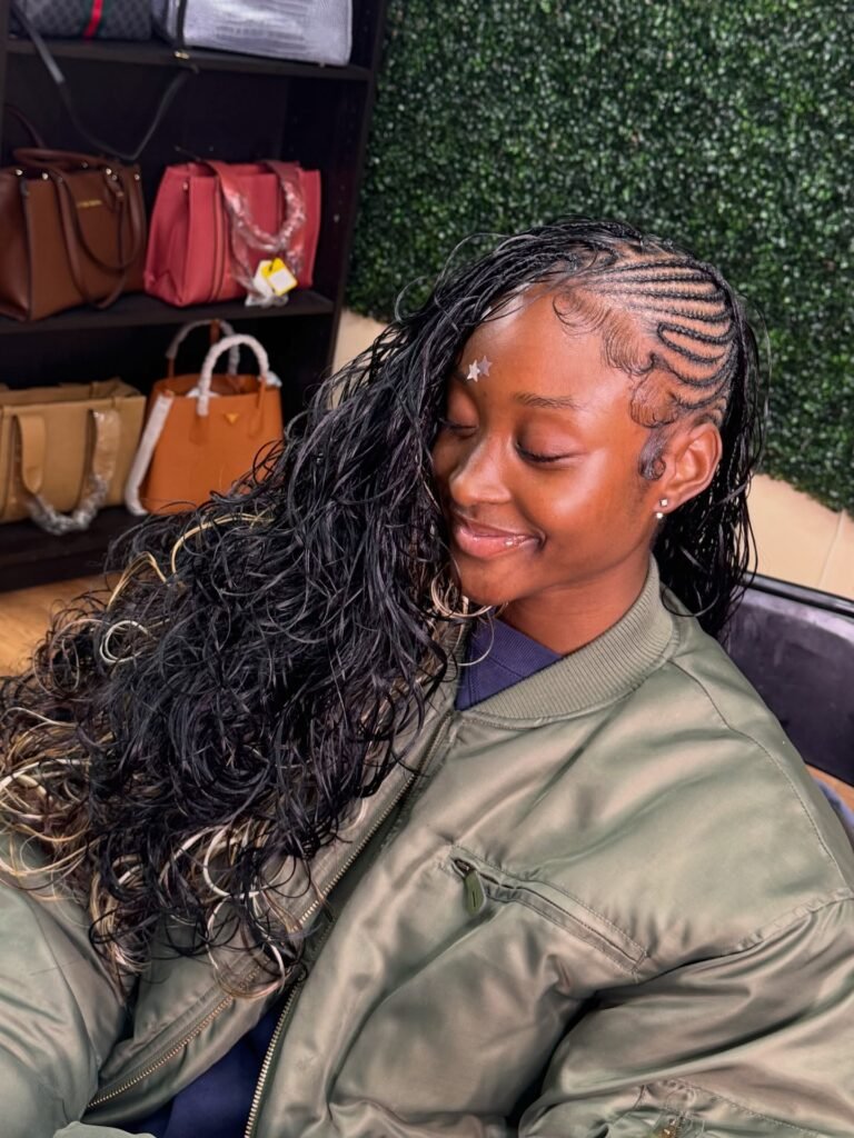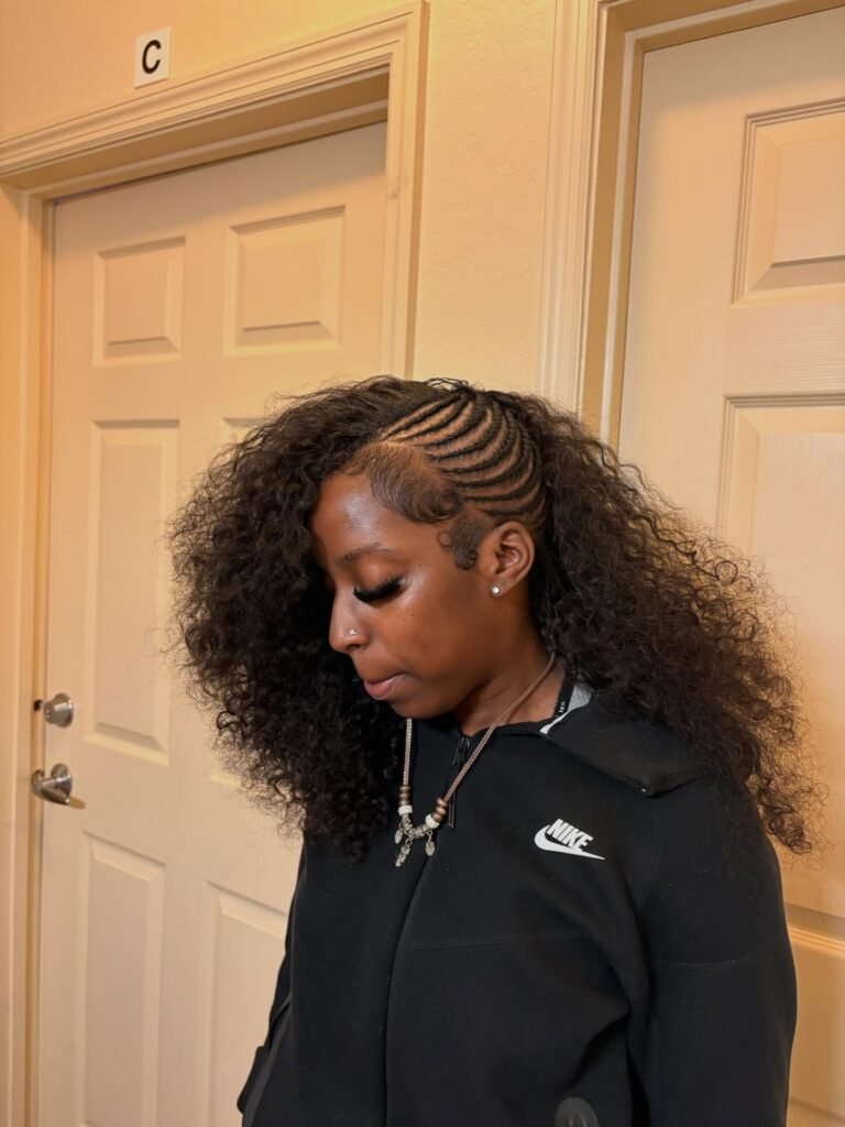 This half-braided, half-curly combination is a masterpiece of texture play — protective, versatile, and absolutely stunning for any occasion.