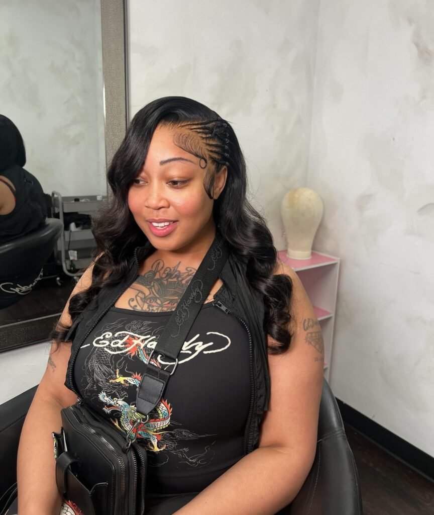 Beautifully swirled baby hair coils along the temple add that irresistible signature Baby Kaylee finishing touch. The sleek, jet-black wavy leave-out cascades gracefully to one side, featuring gorgeous loose waves that curl beautifully at the ends — creating a perfect balance between structured artistry and flowing softness.