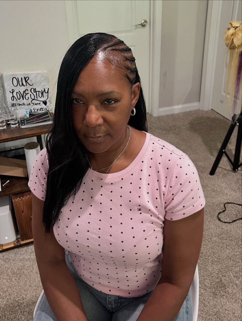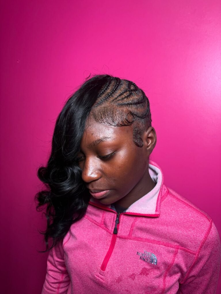This absolutely gorgeous style is pure Baby Kaylee glamour at its finest! Delicate, precisely braided cornrows sweep elegantly along the hairline at the temple, creating a beautiful decorative detail that adds incredible artistry to the overall look.