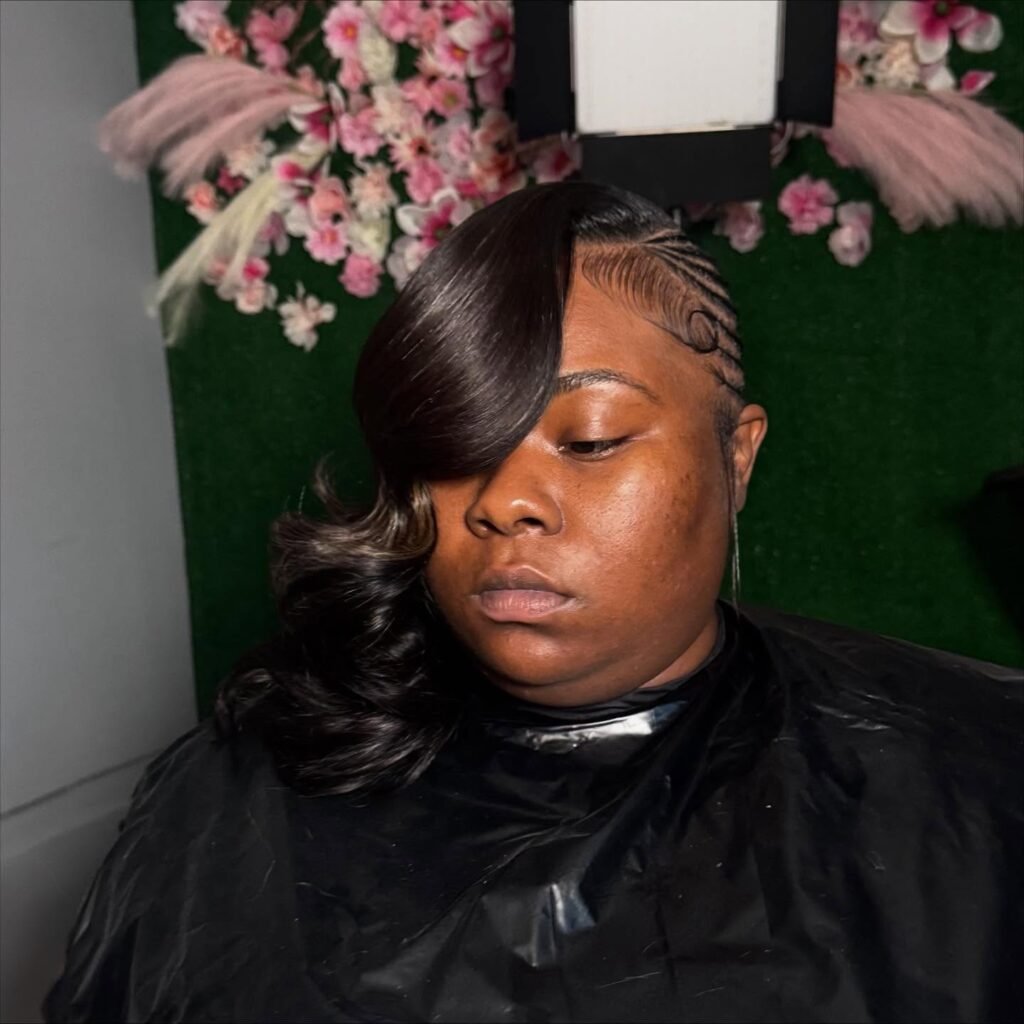 This baby kaylee hairstyle showcases a flawless blend of sleek styling and soft glamour, making it a standout choice for polished occasions. The deep side part creates instant structure, while the sculpted baby hairs add signature definition and artistic detail along the hairline.