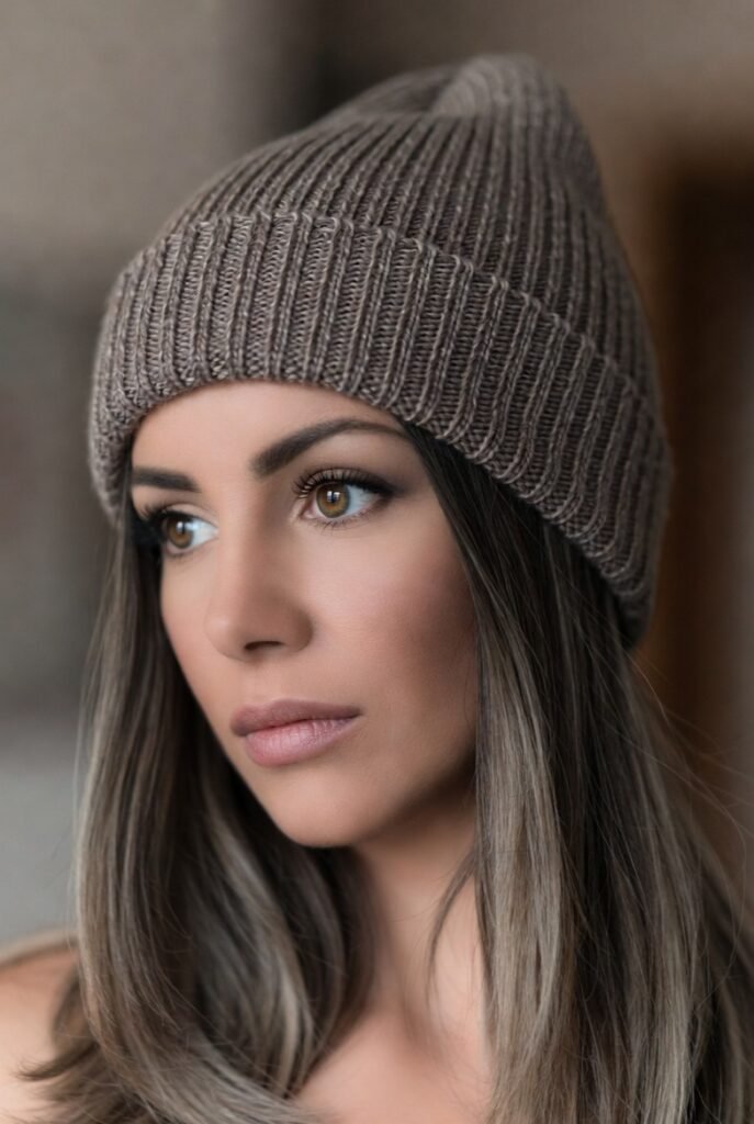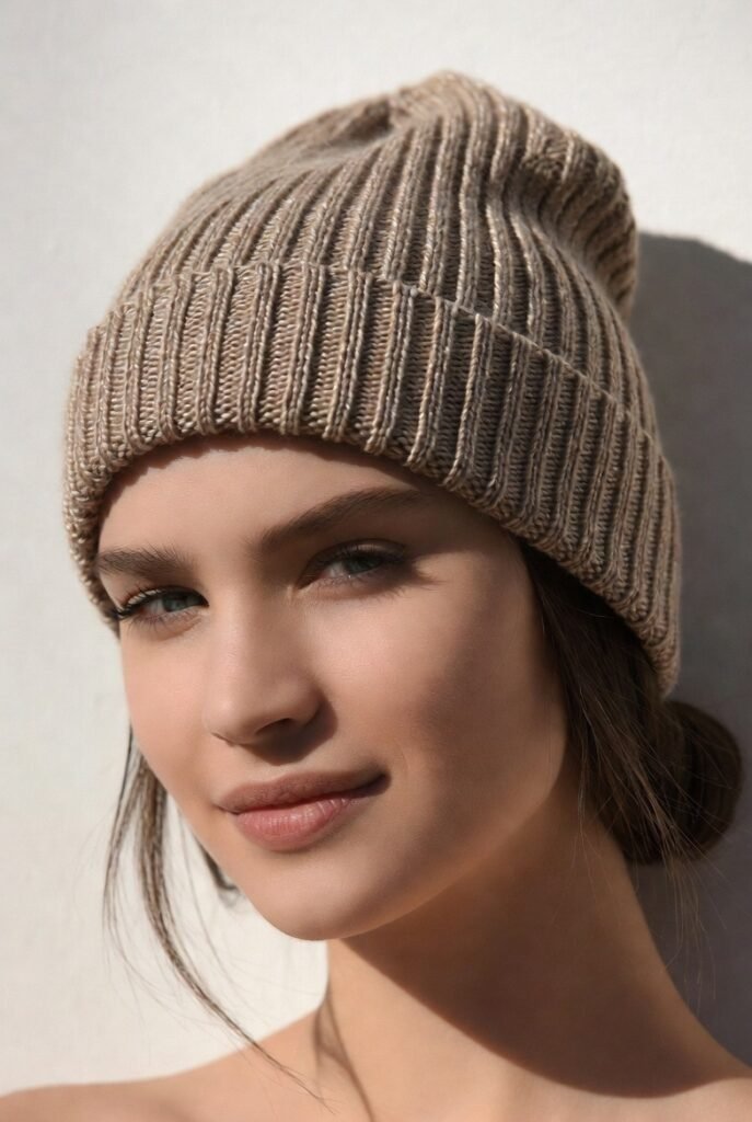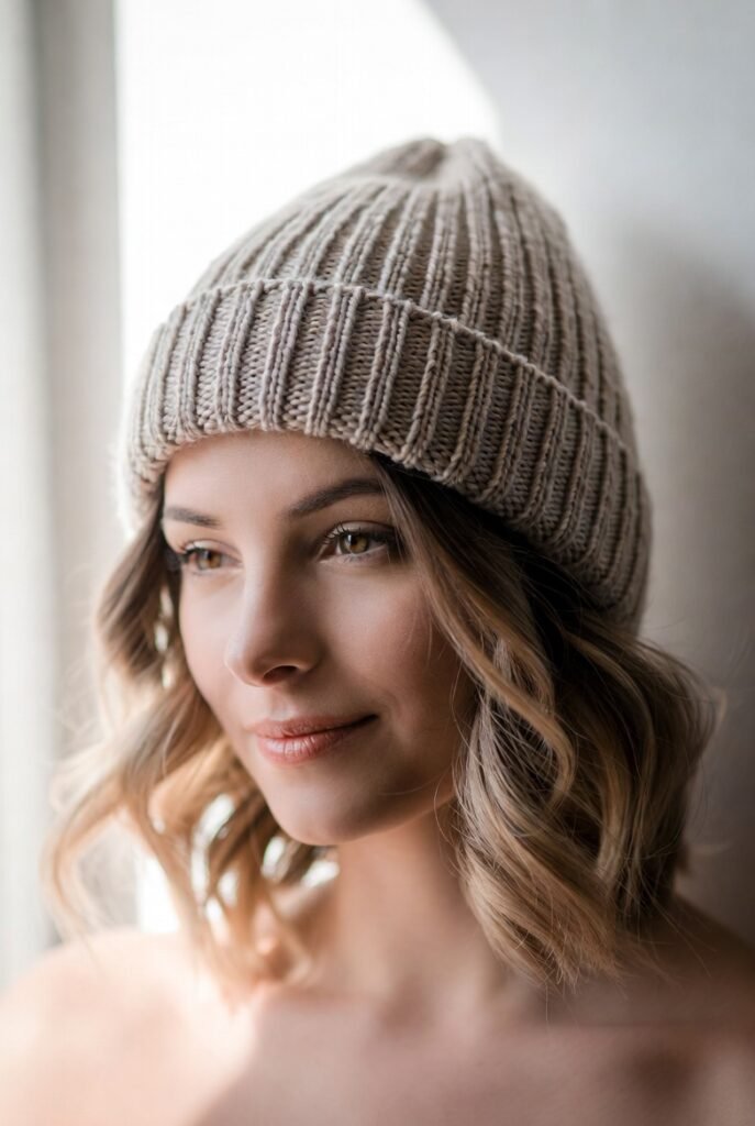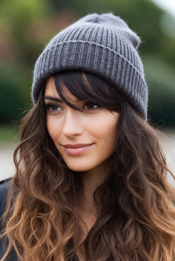 There’s something undeniably cool about pairing a taupe ribbed beanie with loose, tousled waves.