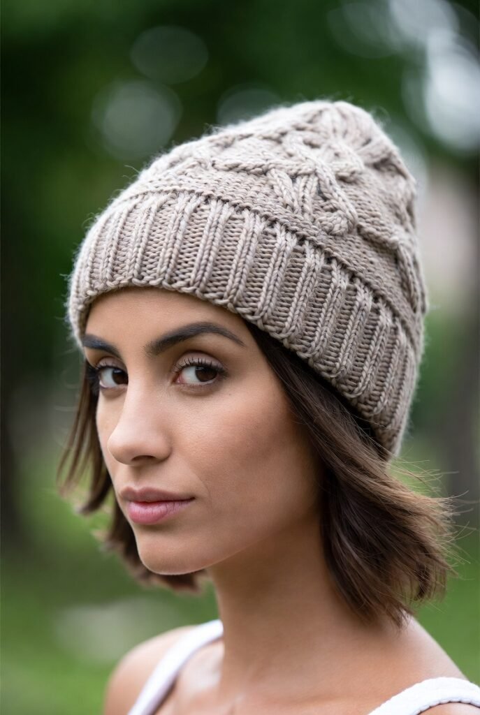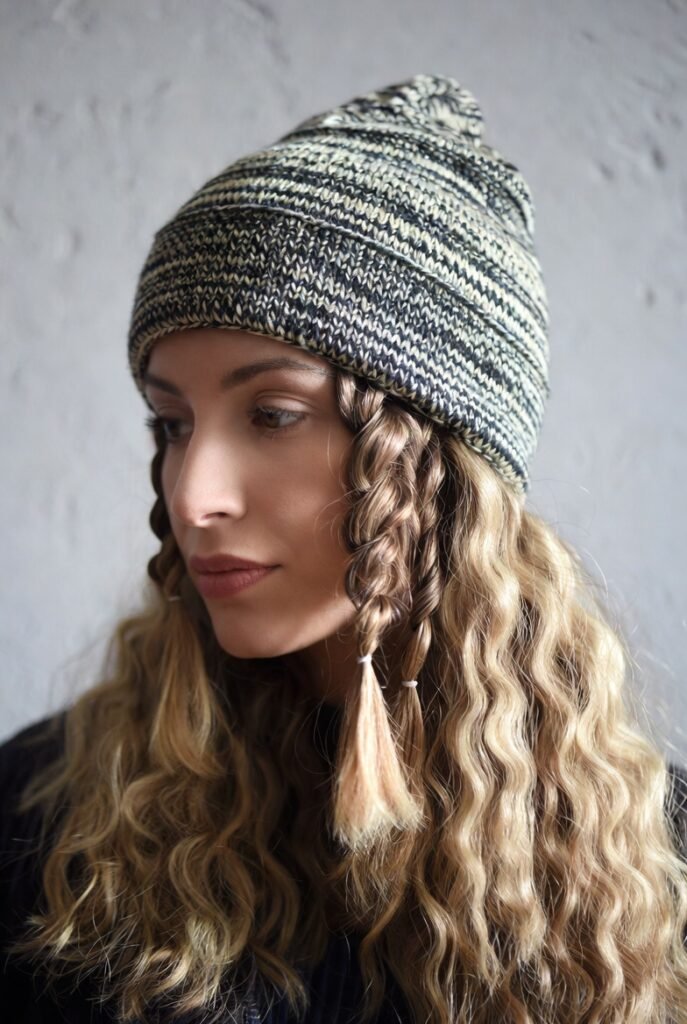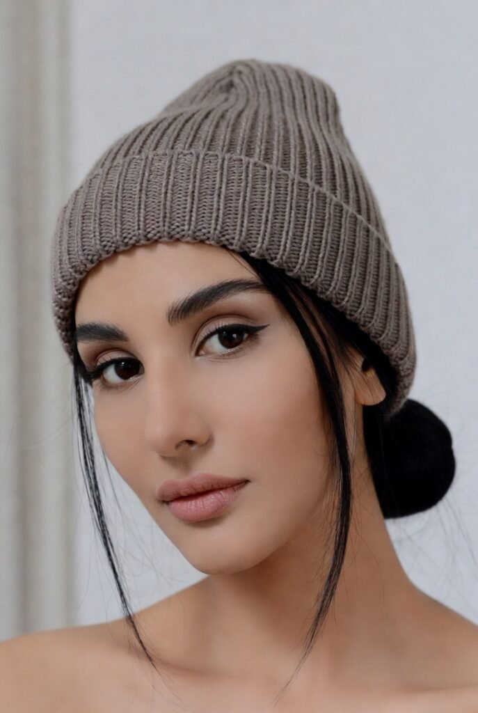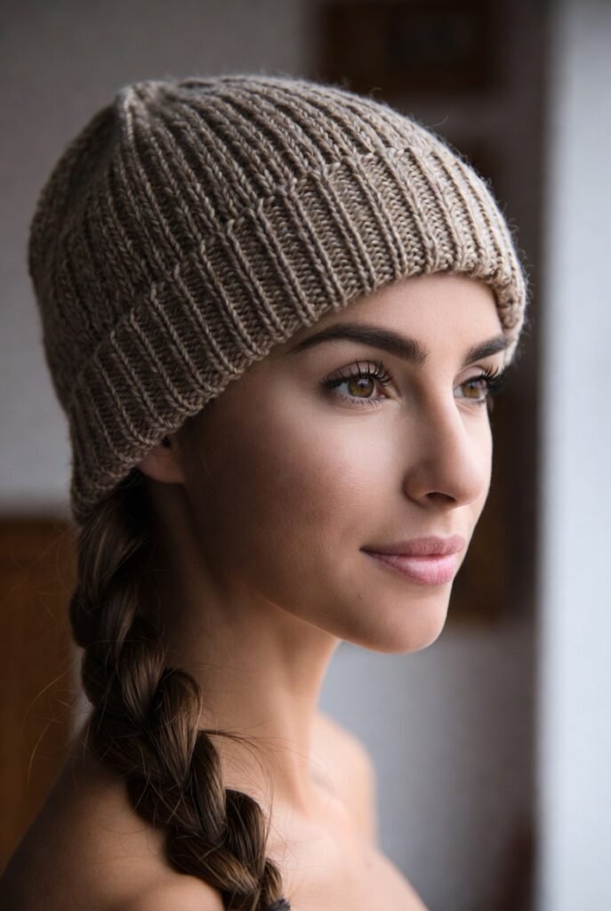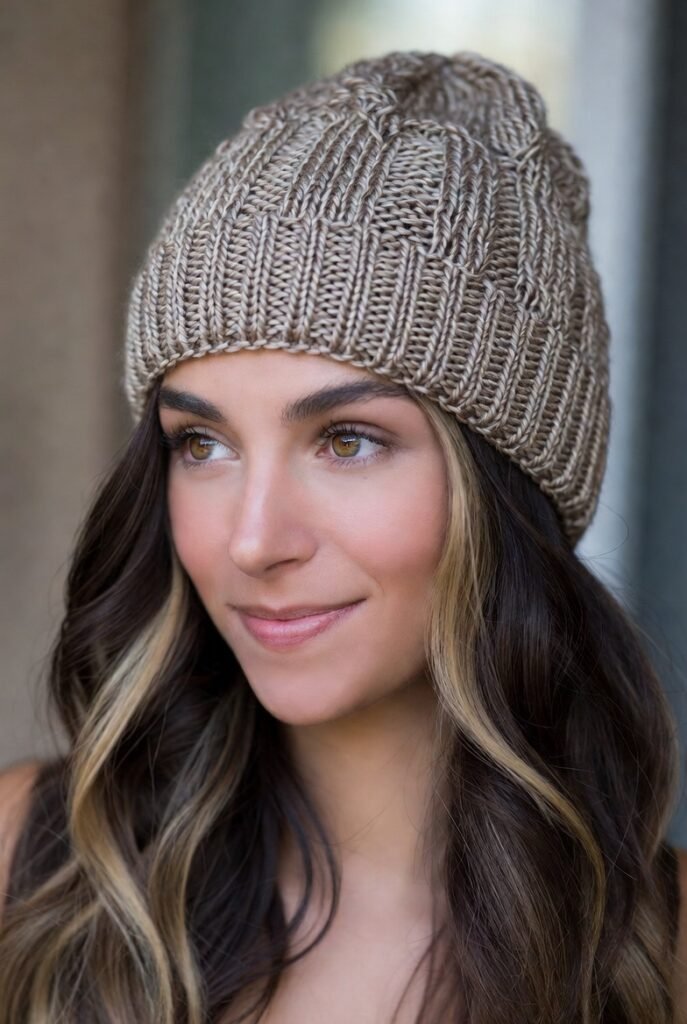 There’s something undeniably cool about pairing a taupe ribbed beanie with loose, tousled waves.