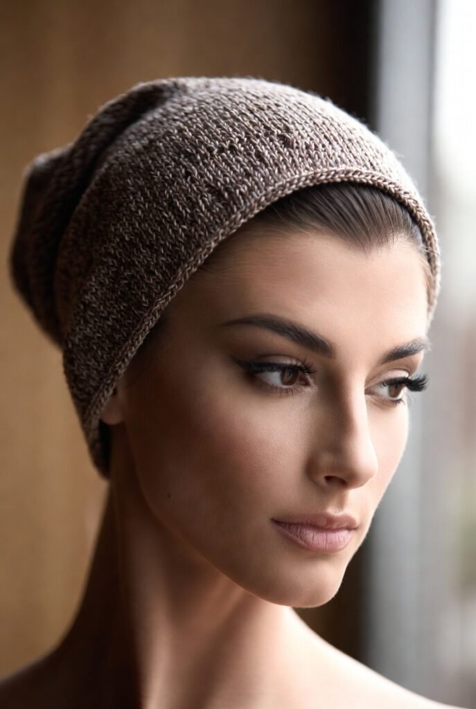 Returning to basics, a simple neutral slouchy beanie with naturally flowing hair never fails.