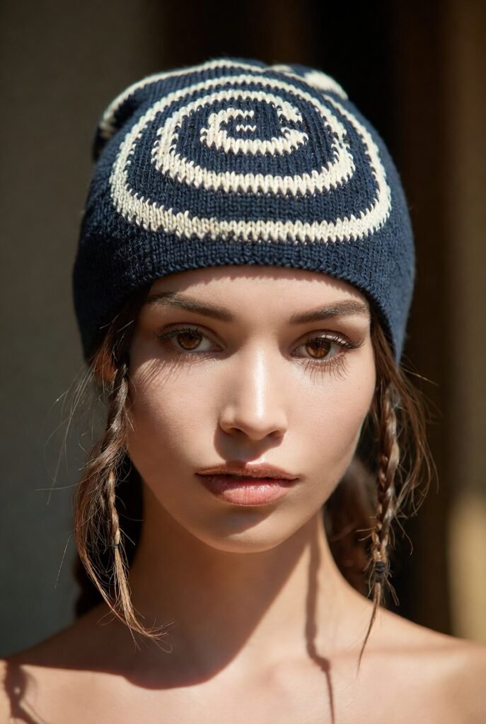 A beanie with a bold spiral pattern creates an artistic focal point that’s conversation-worthy.
