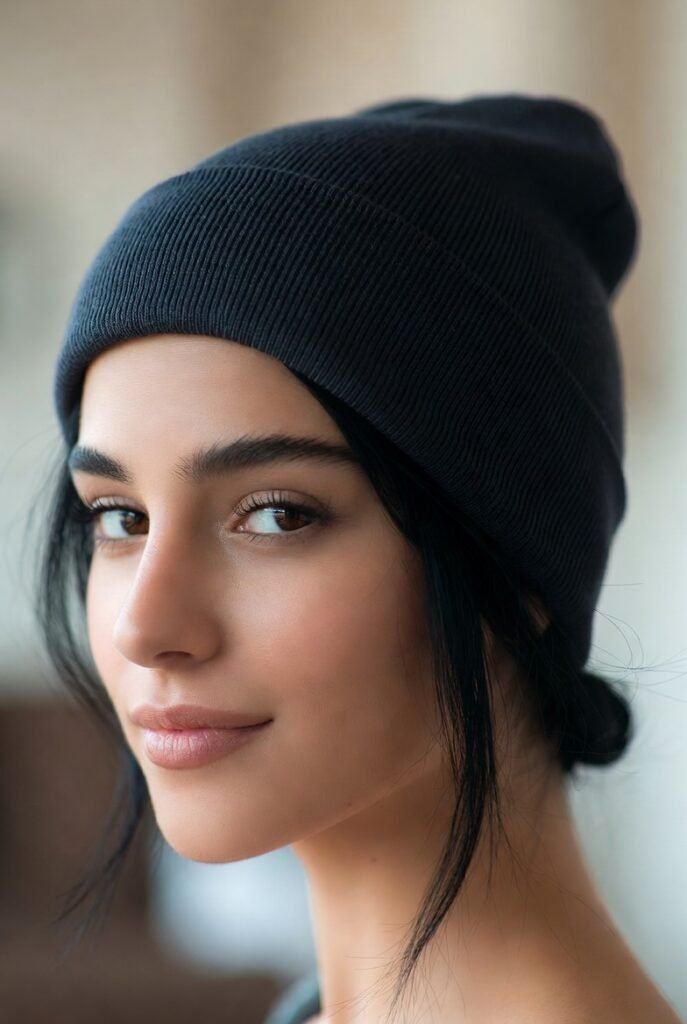 A fitted black beanie worn with sleek hair creates a sophisticated, modern aesthetic.