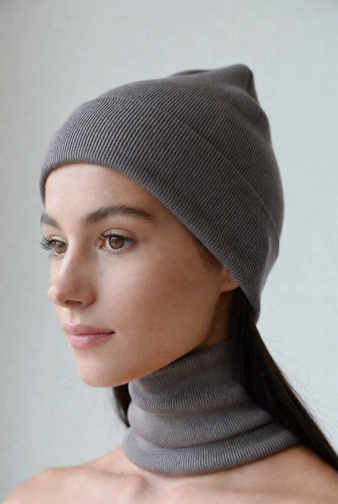 A perfectly fitted charcoal beanie creates a sleek, streamlined silhouette that’s effortlessly cool.