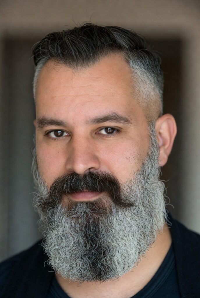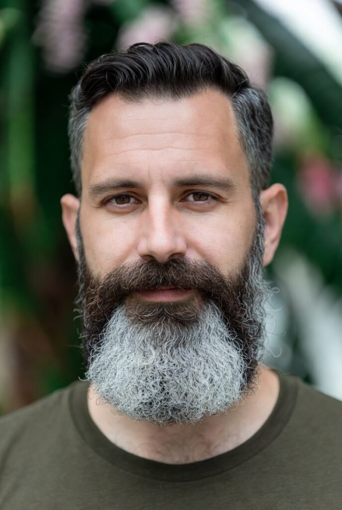 The contrast between the darker hair on top and the silver beard creates a striking visual that’s hard to ignore.