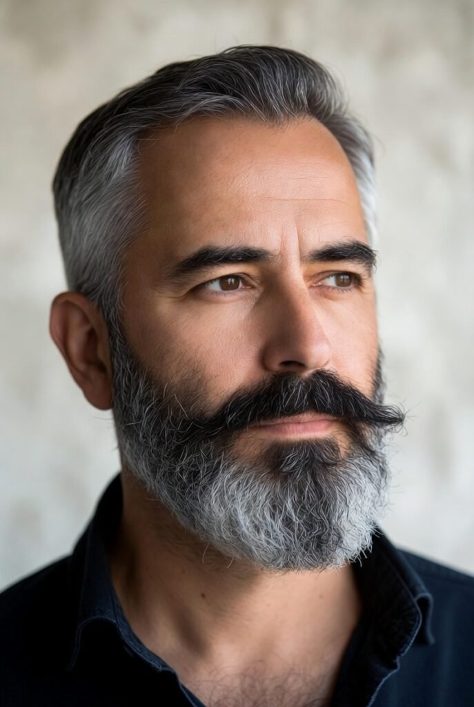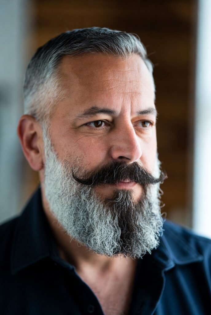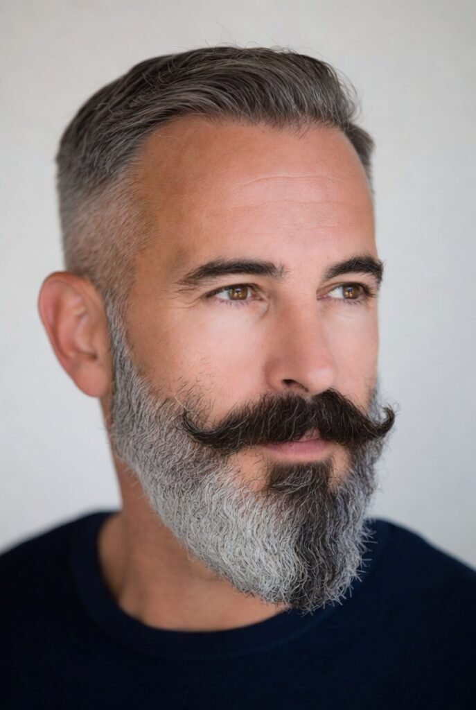The salt-and-pepper coloring looks intentional and sophisticated, while the handlebar mustache adds a touch of personality and flair.