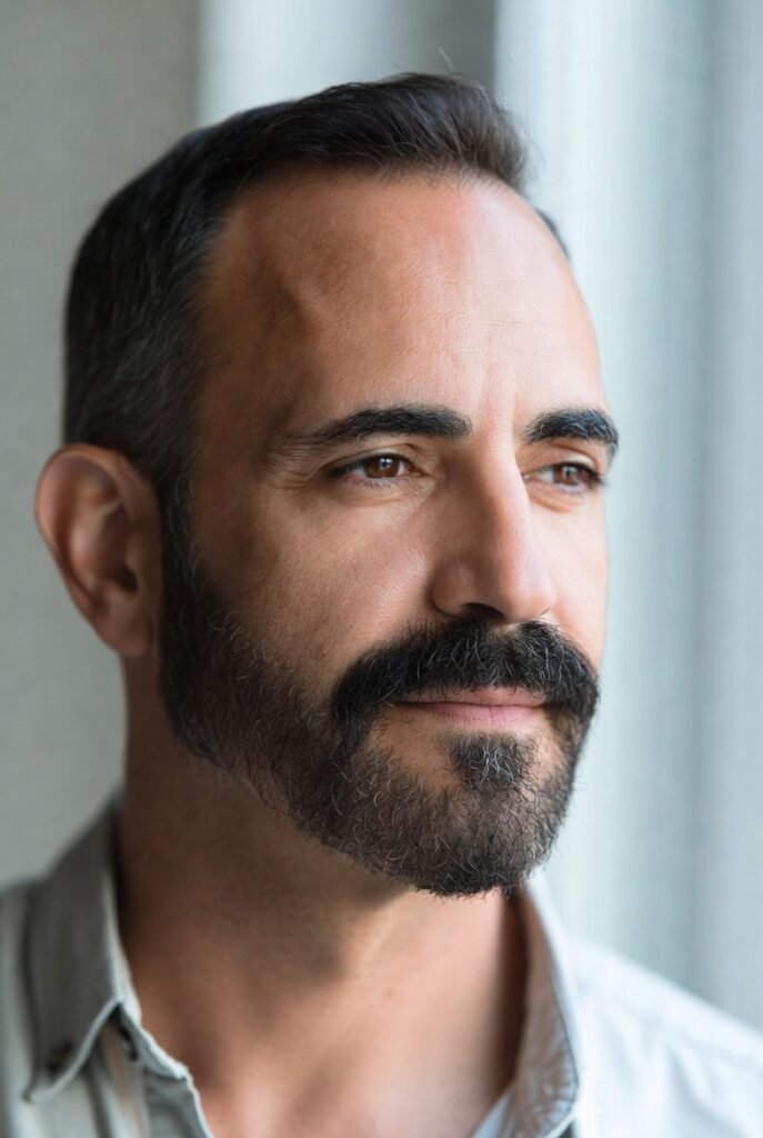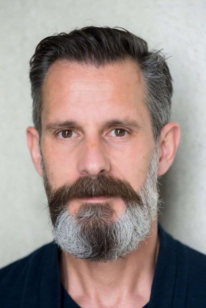 The gray comes through naturally, particularly at the chin, adding character without overwhelming the face.
