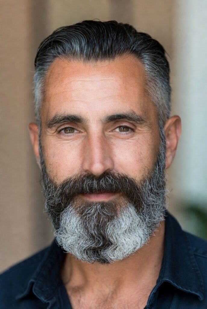 There’s something captivating about this combination of swept-back hair and a full, gray-dominant beard.