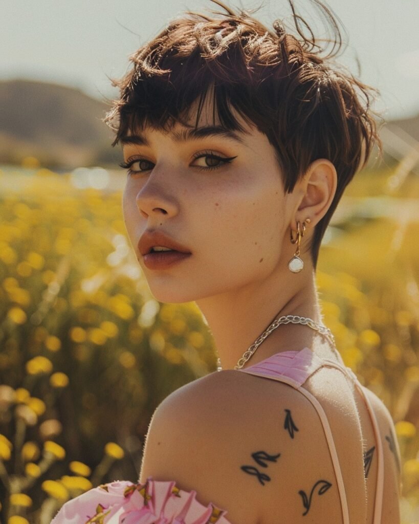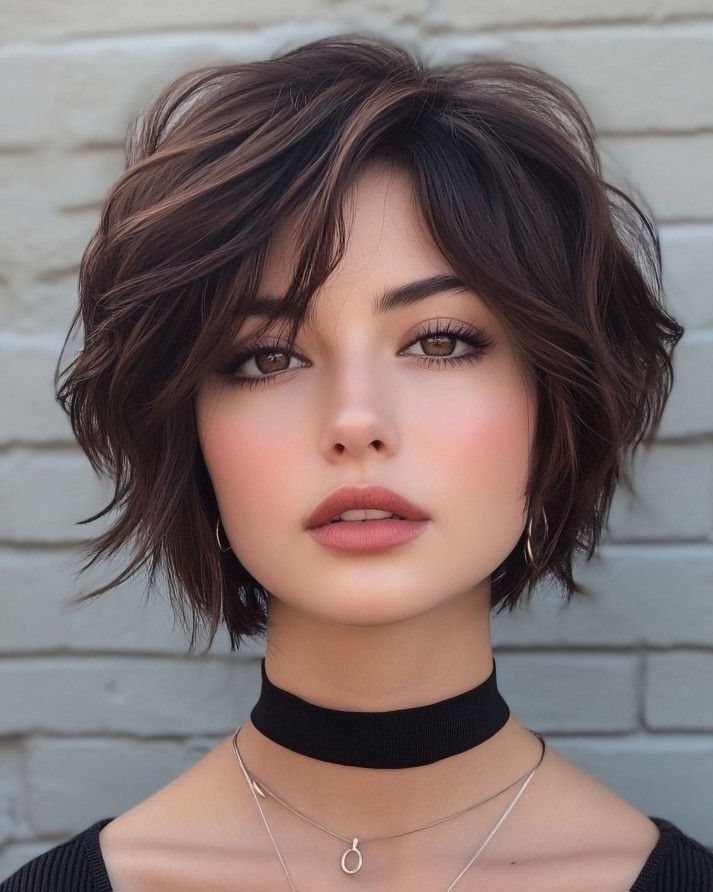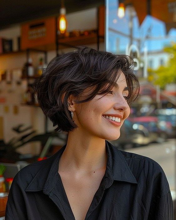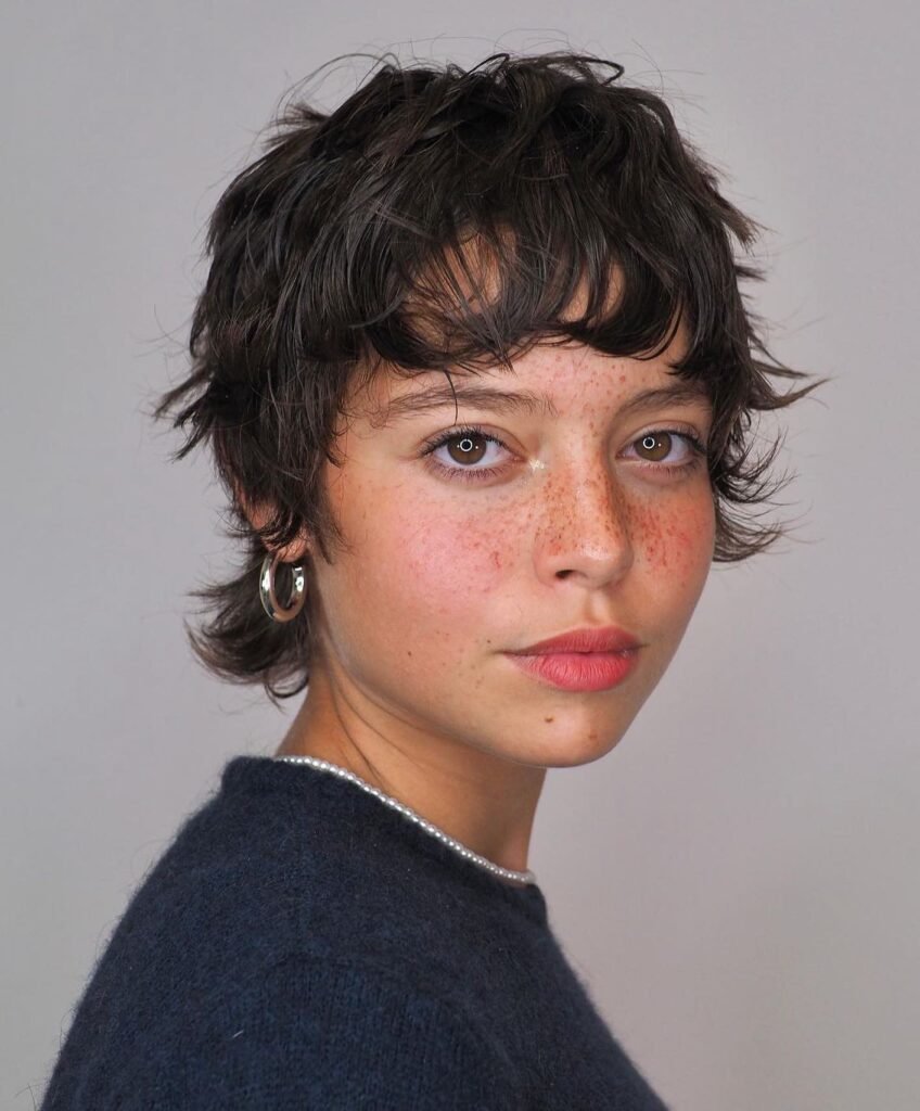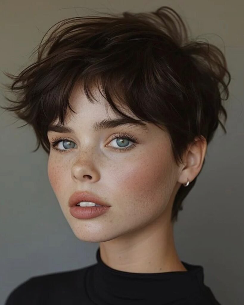 Joyful, free-spirited, and radiating the kind of effortless charm that simply cannot be manufactured — this windswept dark brunette bixie is a masterclass in relaxed, natural short hair styling. The cut carries beautiful volume at the crown that lifts and scatters freely, with feathered ends that fan outward in multiple directions as though caught mid-movement by a warm, gentle breeze.
