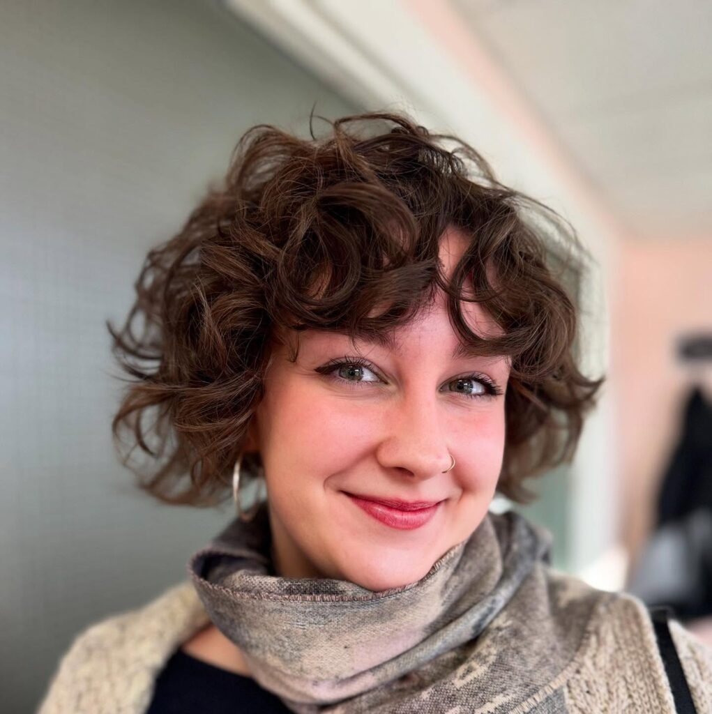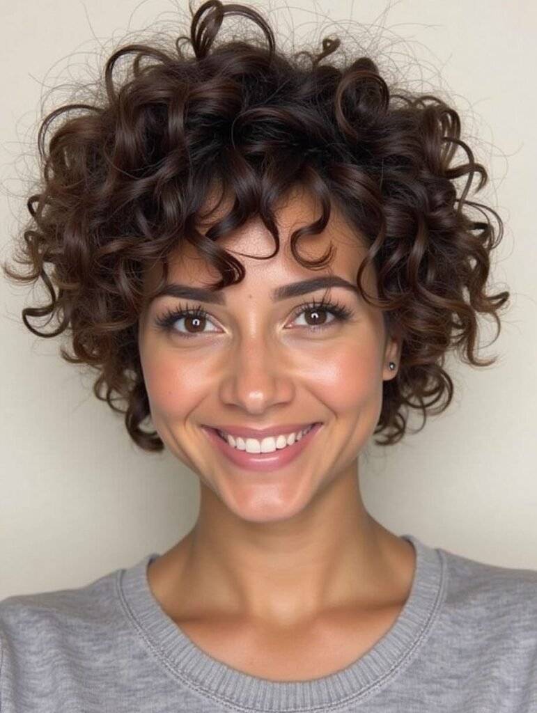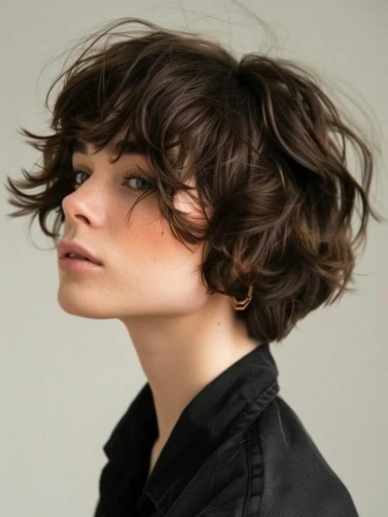 Short curly bangs soften the forehead and frame the face, giving the style a youthful, playful energy that feels very reminiscent of retro 90s salon trends. The curls naturally build volume around the crown and sides, making this bixie especially flattering for round, oval, and heart-shaped faces.