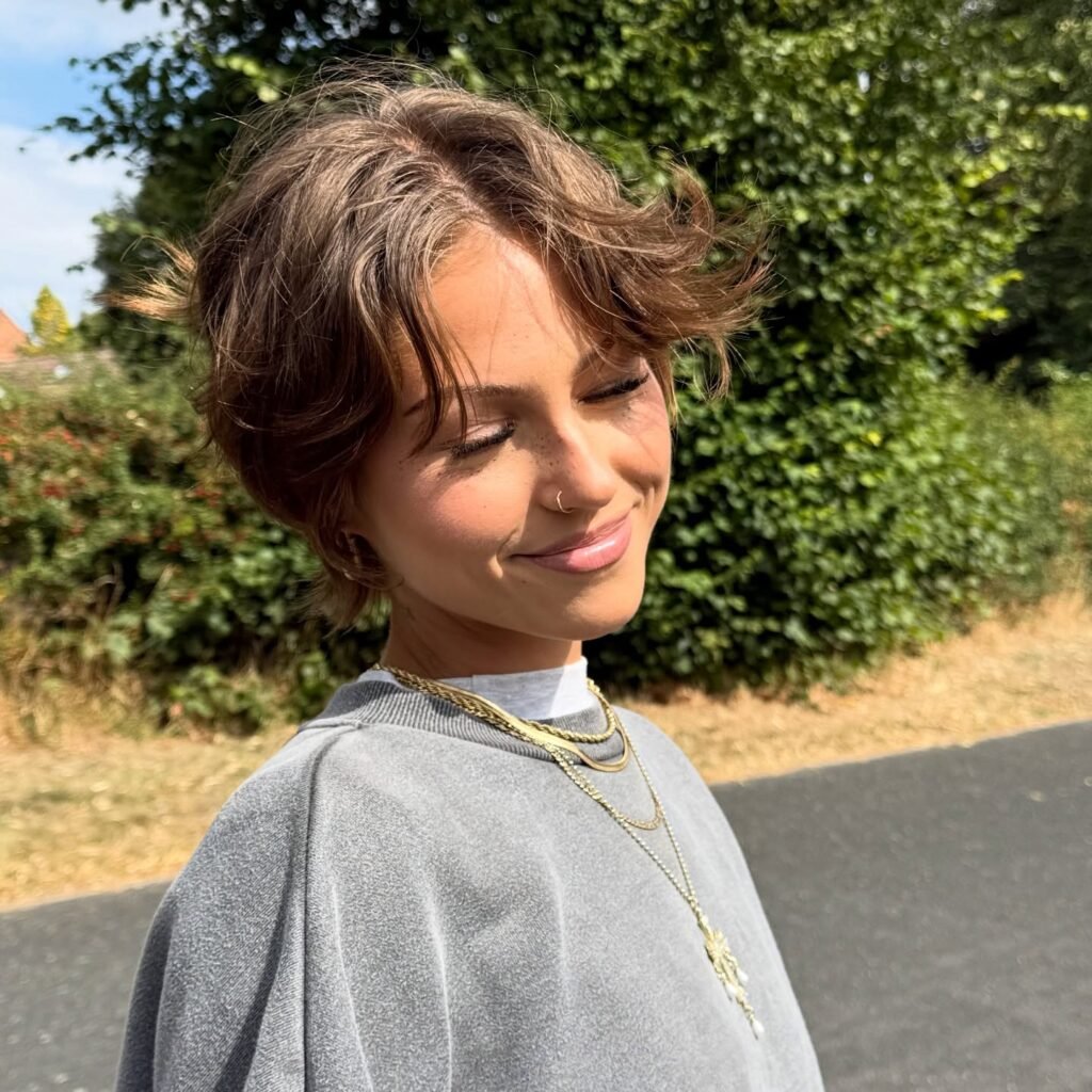 Carefree, sun-drenched, and radiating effortless summer energy — this breezy bixie is the kind of haircut that looks like it was made for golden hour. The cut sits at that perfect bixie length, full enough to carry beautiful natural movement yet short enough to feel liberating and light in the warmest months. Wind-tousled waves lift freely from the crown, giving the style an organic, unforced vitality that no amount of careful styling could fully replicate.
