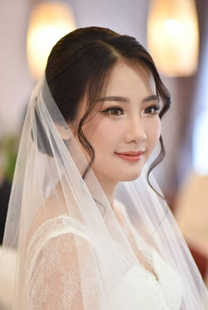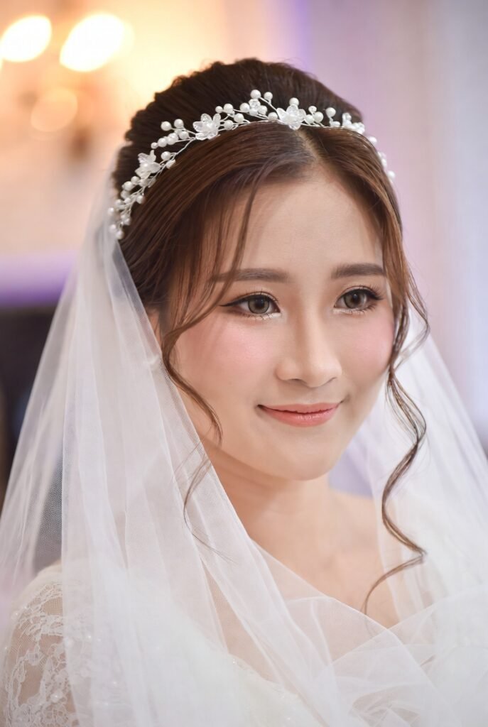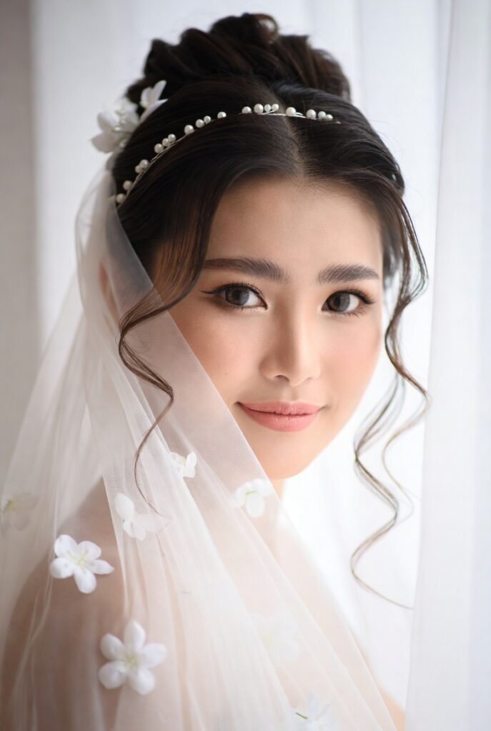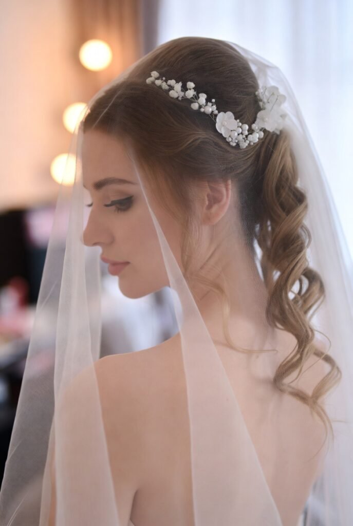 The veil drapes gently, creating lovely layering. What’s wonderful about this look is its gentle, feminine quality—nothing harsh or overdone, just soft, pretty details that enhance your natural beauty.
