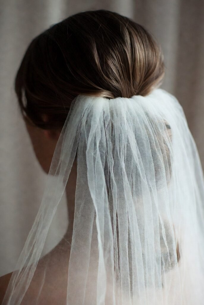 The hair is pulled back without a single strand out of place, creating clean, sophisticated lines. The veil is gathered at the base, creating beautiful volume and softness.