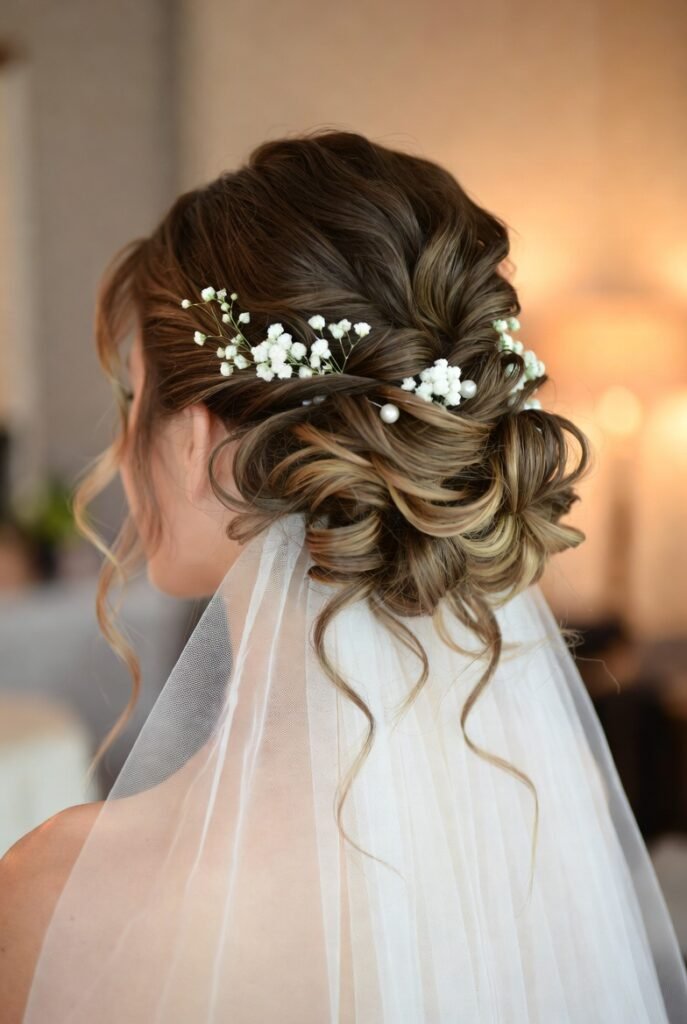 Baby’s breath is woven throughout, adding that fresh, garden-party feel. The veil attaches just below, letting the intricate hair work shine.