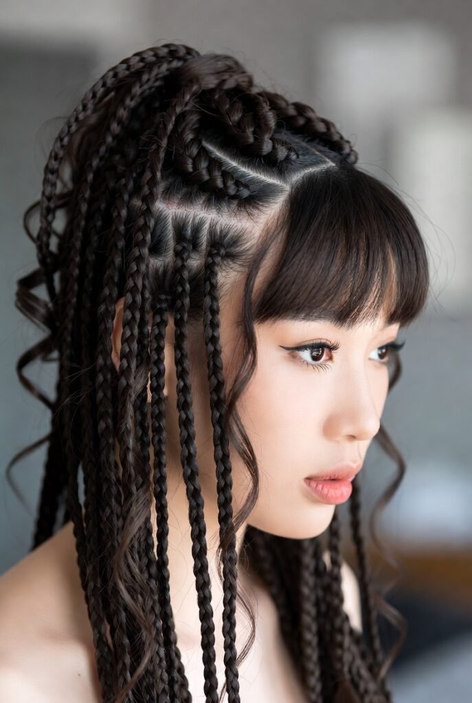 You can opt for full bangs across your forehead or side-swept bangs that blend into the rest of your braids. Both options work beautifully depending on your face shape.