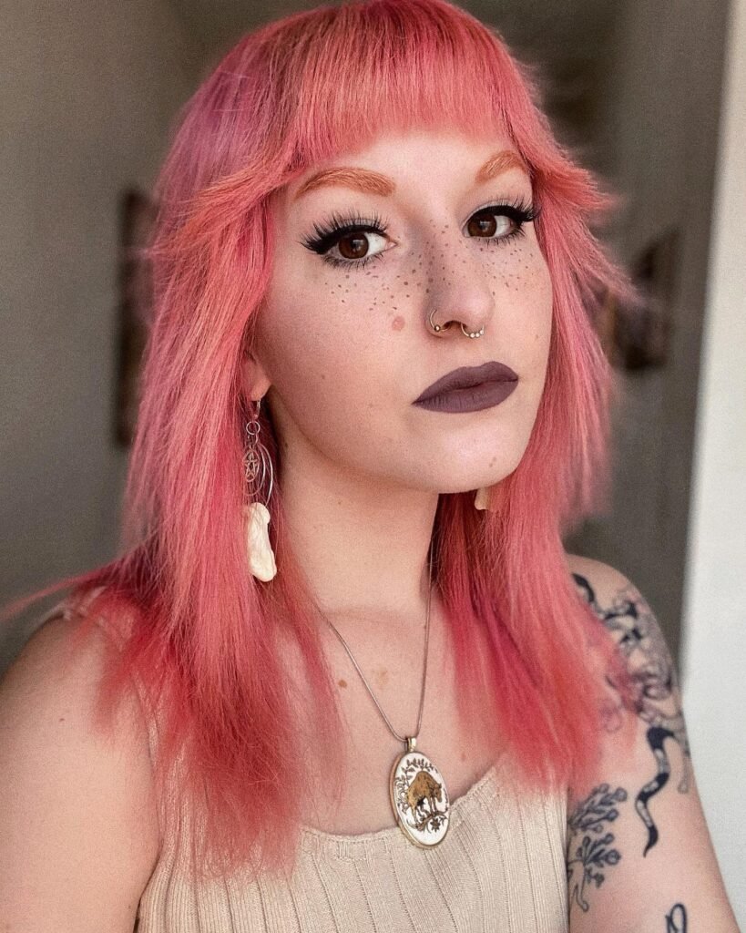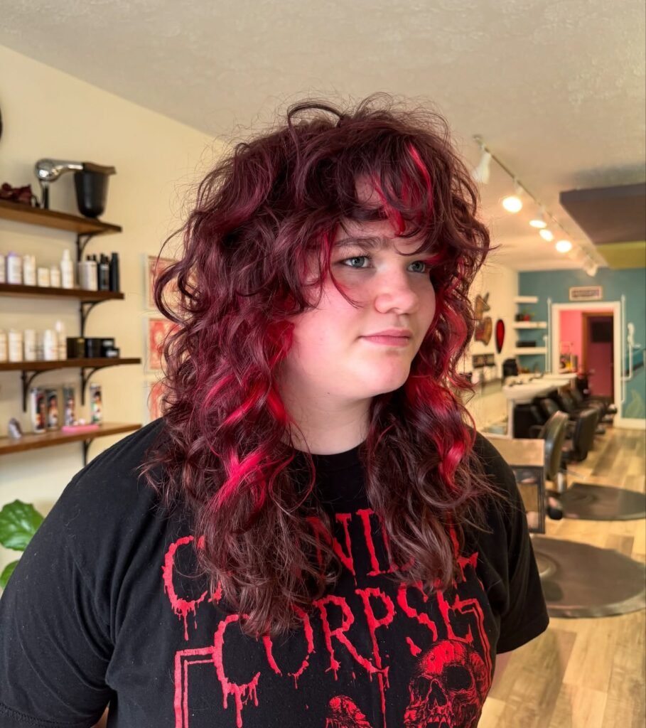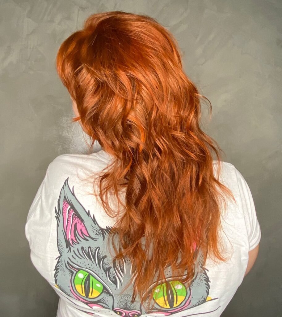 The cut clearly works with the hair’s natural texture instead of against it, which is exactly what makes a great wolf cut. That warm orange-red tone feels both vintage and completely modern at the same time.