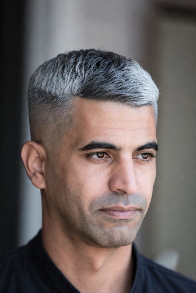 A contemporary short cut featuring a seamless fade from skin to grey hair on top.