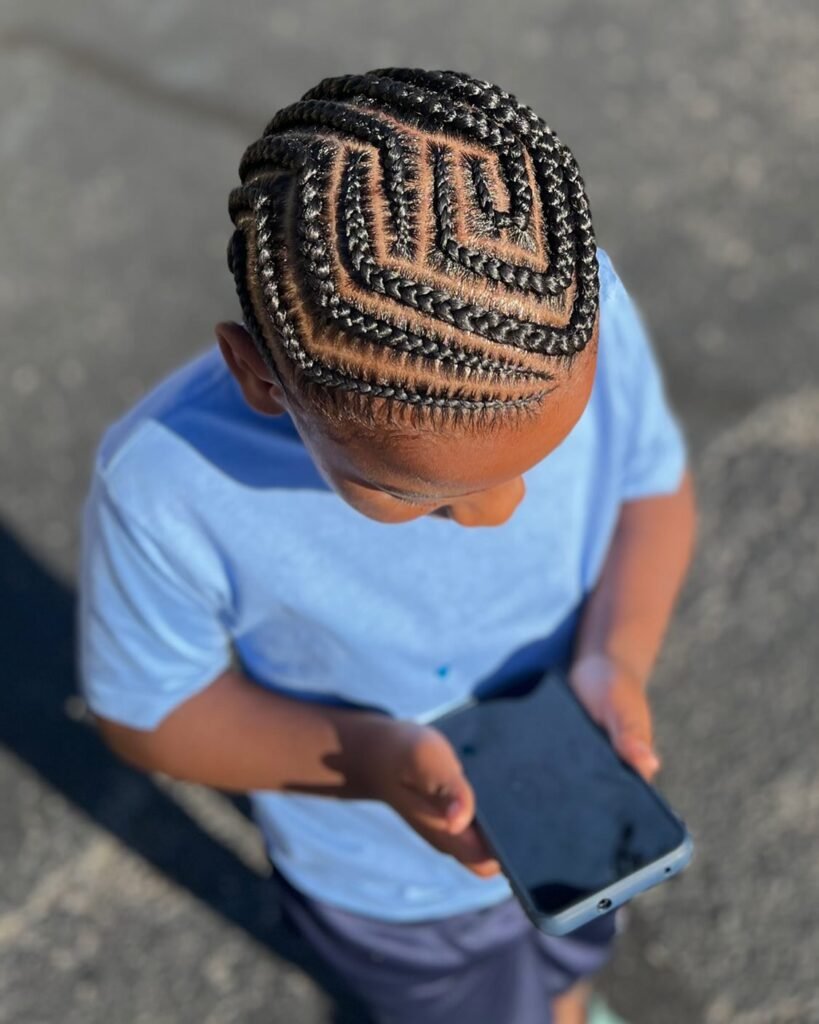 This striking hairstyle for boys showcases incredible artistry with its intricate braided patterns. The braids are tightly woven in a geometric design across the scalp, creating a unique and personalized look.