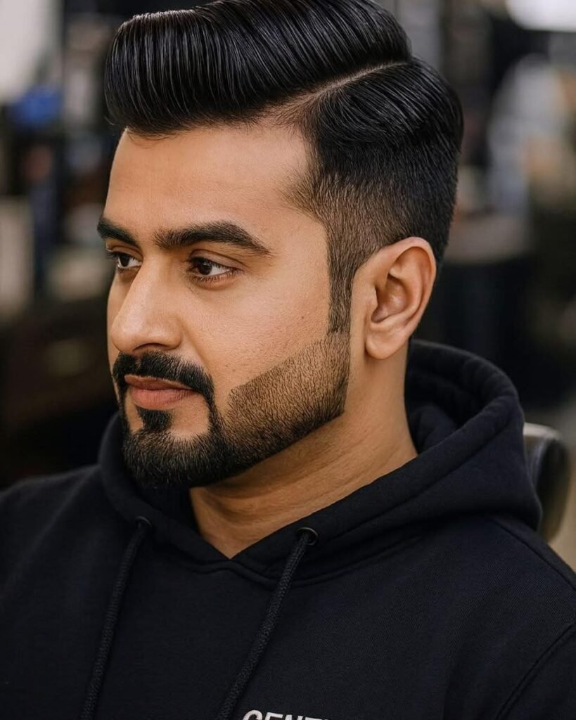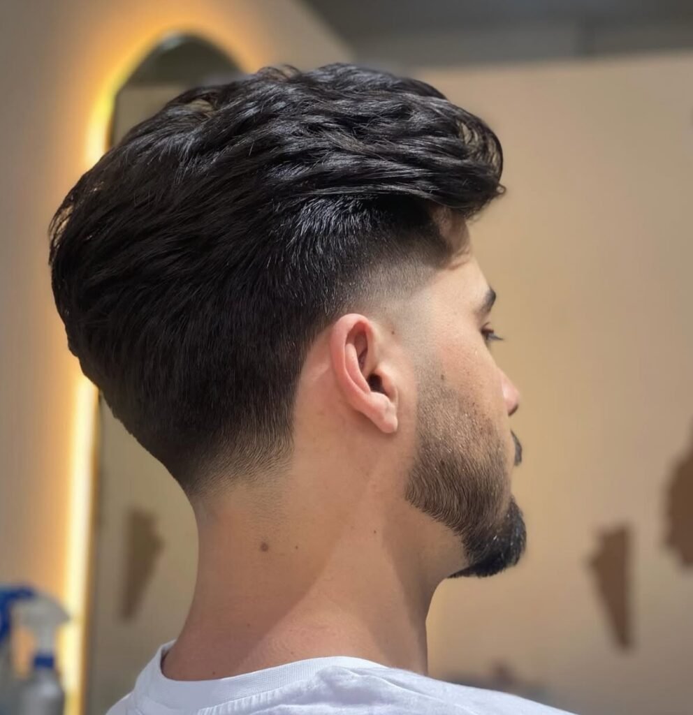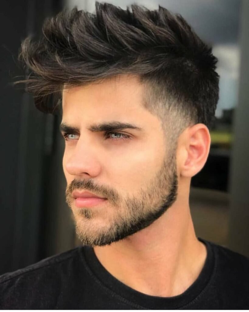 For a sharp and confident appearance, this hairstyle for boys combines a spiky, textured top with a neatly trimmed beard. The hair on top is styled upwards, creating a dynamic and edgy silhouette. This is complemented by a clean fade on the sides, which blends seamlessly into a well-defined beard.