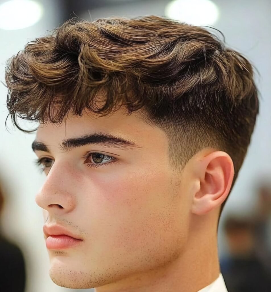This hairstyle for boys truly embraces natural texture with a modern twist. The top features a generous amount of wavy hair, artfully styled forward to create a soft, textured fringe. This playful look is balanced by a sharp, clean fade on the sides, offering a neat contrast.