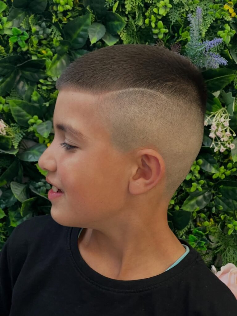 This daring hairstyle for boys combines a very short buzz cut with an emphasized shaved line, creating a bold statement. The top and upper sides are trimmed closely, while a prominent horizontal line is etched into the hair. This sharp detail adds an element of rebellion and modern flair.