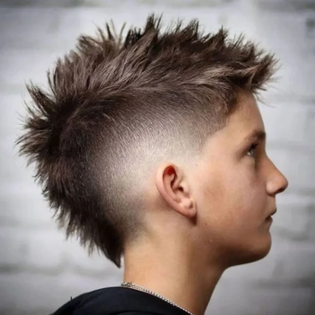 This bold and energetic hairstyle for boys is all about expressing individuality. Short, choppy layers are styled upwards to create a textured, spiky effect that stands out. The sides are expertly faded, adding a clean contrast to the playful spikes on top.