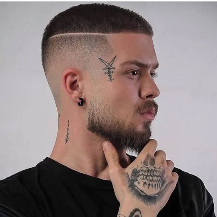 For a super clean and sporty aesthetic, this hairstyle for boys features a short buzz cut on top. A distinct hard part, shaved precisely into the side, adds a touch of edgy detail. The sides are faded down to a very short length, creating a sharp and minimalist silhouette.