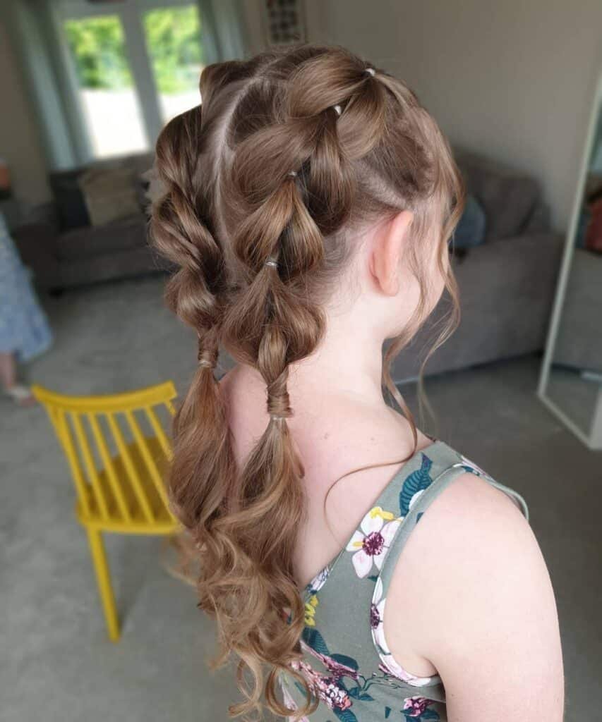Charming, creative, and built to handle every spin, leap, and floor sequence a young dancer can throw at it — this pull-through braid ponytail with curly ends is a wonderfully inventive practice hairstyle that keeps hair completely secure while delivering genuinely impressive visual impact. The pull-through braid technique creates a series of voluminous, looped sections that stack beautifully one above the other down the center back, each rounded bubble section secured with a small clear elastic that cinches the style at regular intervals and gives the overall braid its distinctive, dimensional appearance.