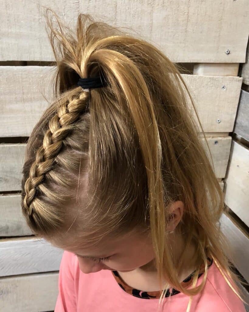 The braid feeds seamlessly into a half-up ponytail secured with a simple black elastic at the crown, where it joins the remaining top section of hair gathered upward in a cheerful, bouncy pouf that adds a playful, youthful energy to the overall style.
