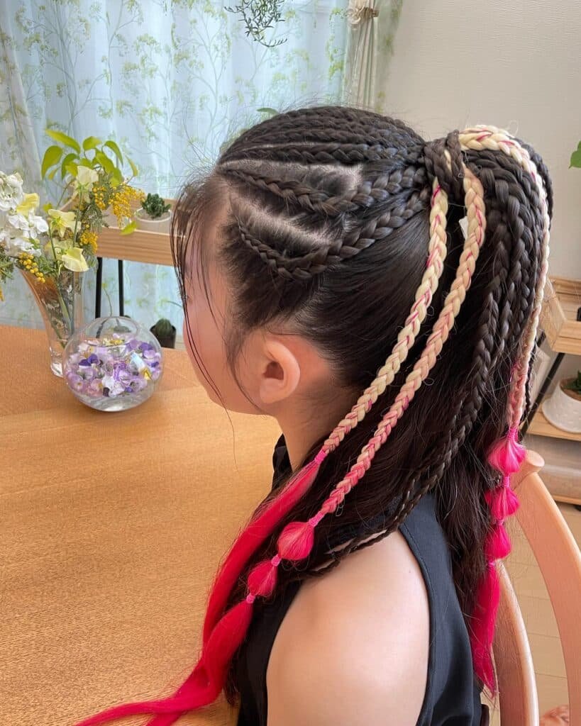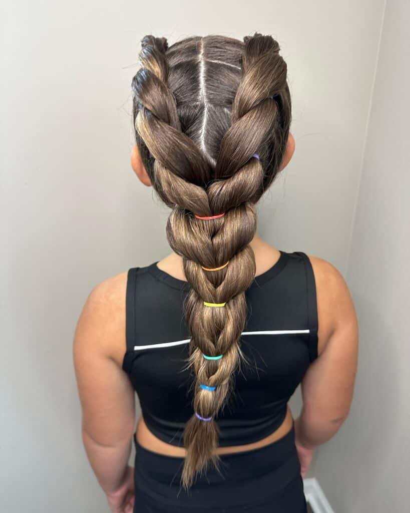 Adding colorful braided extensions enhances the visual appeal while maintaining practicality. The tight braiding pattern helps control flyaways and keeps the hair lightweight and manageable during intense routines.