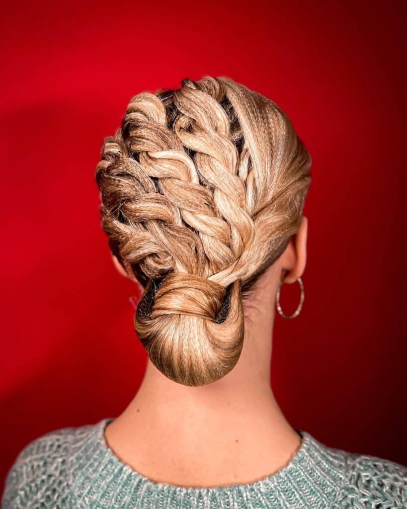 At the nape, the braid transitions seamlessly into a neat, compact low bun that sits close and flat against the head, eliminating any bulk or protrusion that could interfere with partner work, floor sequences, or rapid directional changes.