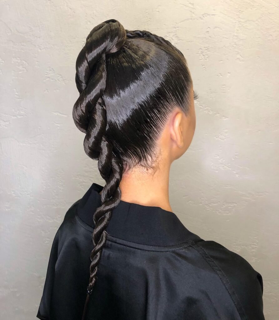 The braids are worked with a generous amount of styling gel, giving the entire back section a sleek, wet-look finish that keeps flyaways completely eliminated and creates a beautifully glossy, almost lacquered surface quality that looks incredibly polished and intentional from every angle.