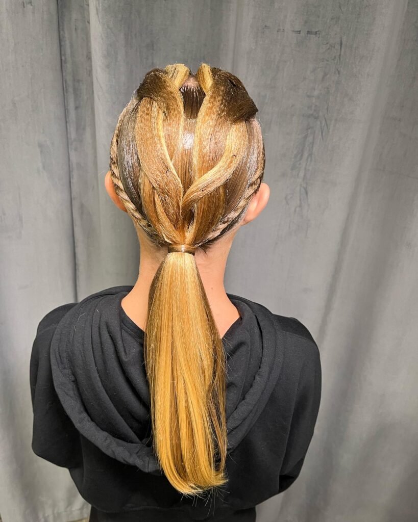 The diagonal braid adds a stylish touch while also improving hold and structure. By guiding the hair into a low ponytail, the style distributes weight evenly, reducing scalp tension and keeping dancers comfortable during long rehearsals.