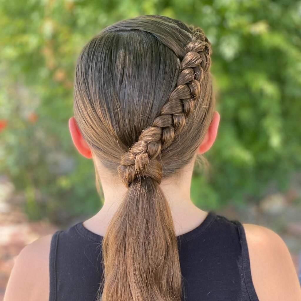 Practical, adorable, and perfectly engineered for little dancers who need their hair completely under control throughout class — this Dutch braid into a half-up ponytail is a wonderfully clever style that combines security with youthful charm. A neat, tightly worked Dutch braid begins at the front hairline on one side and travels diagonally across the crown, picking up sections cleanly as it progresses to create a flat, secure braid that hugs the scalp firmly and keeps every strand away from the face throughout the most energetic movement.