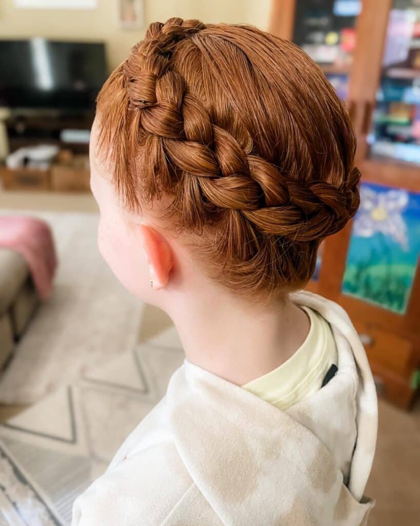 Utterly enchanting and impressively functional — this Dutch crown braid updo is a beautifully executed full updo that keeps every strand of hair completely secure and elegantly contained, making it an exceptional choice for young dancers who need reliable, all-day hold throughout their practice sessions. A single, generously sized Dutch braid is worked around the entire circumference of the head in a continuous crown formation, beginning at one side of the hairline and traveling all the way around the head before tucking neatly at the starting point to create a seamless, perfectly circular braid halo.
