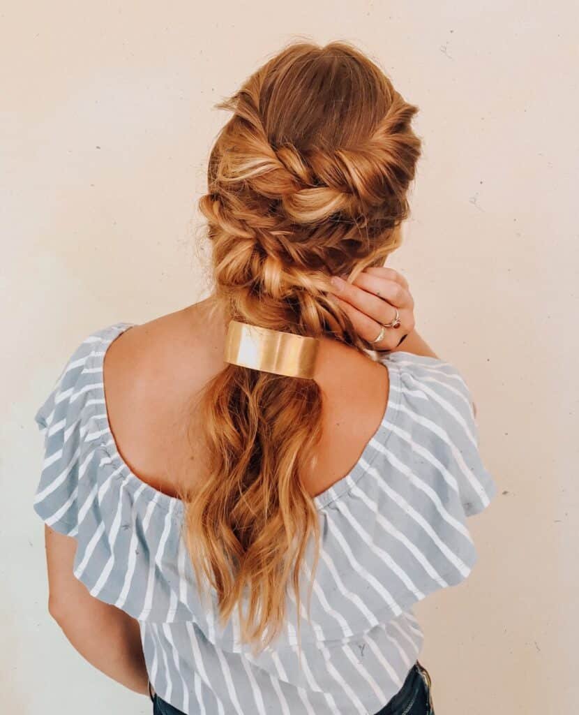 11. Boho Twisted Updo with Gold Cuff Low Ponytail