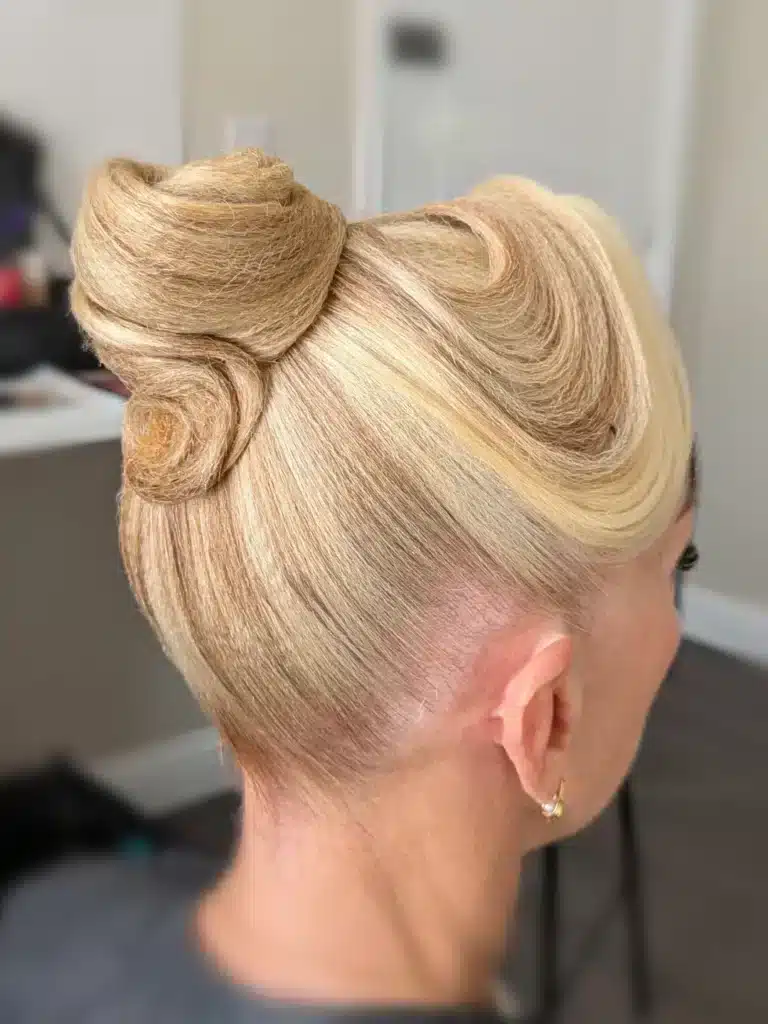 At the crown, the gathered hair is wound into a classic high ballet bun, finished with an additional twisted rose coil detail tucked beside it that adds a beautifully ornamental, distinctly feminine quality without adding any problematic bulk or imbalance.