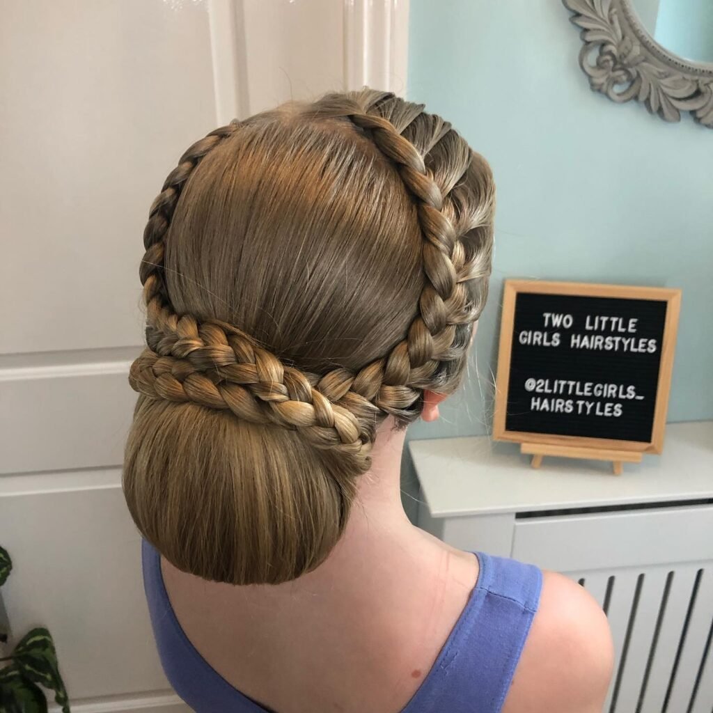 Regal, intricate, and delivering the kind of head-turning dance hairstyle that looks equally stunning from across a studio or up close on a competition stage — this double halo braid with a low sleek bun is a genuinely spectacular updo that combines security, elegance, and remarkable braiding artistry in one unforgettable style. Two substantial Dutch or French braids are worked simultaneously around the entire perimeter of the head, one following directly above the other in perfectly parallel formation, creating a stunning double-stacked halo effect that encircles the head like a beautifully crafted crown.