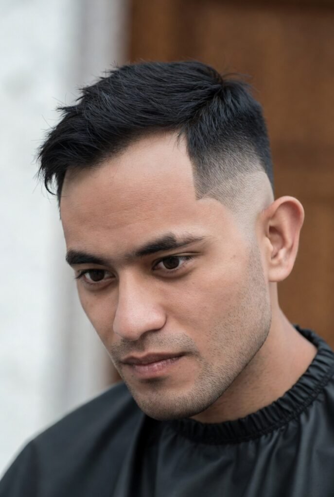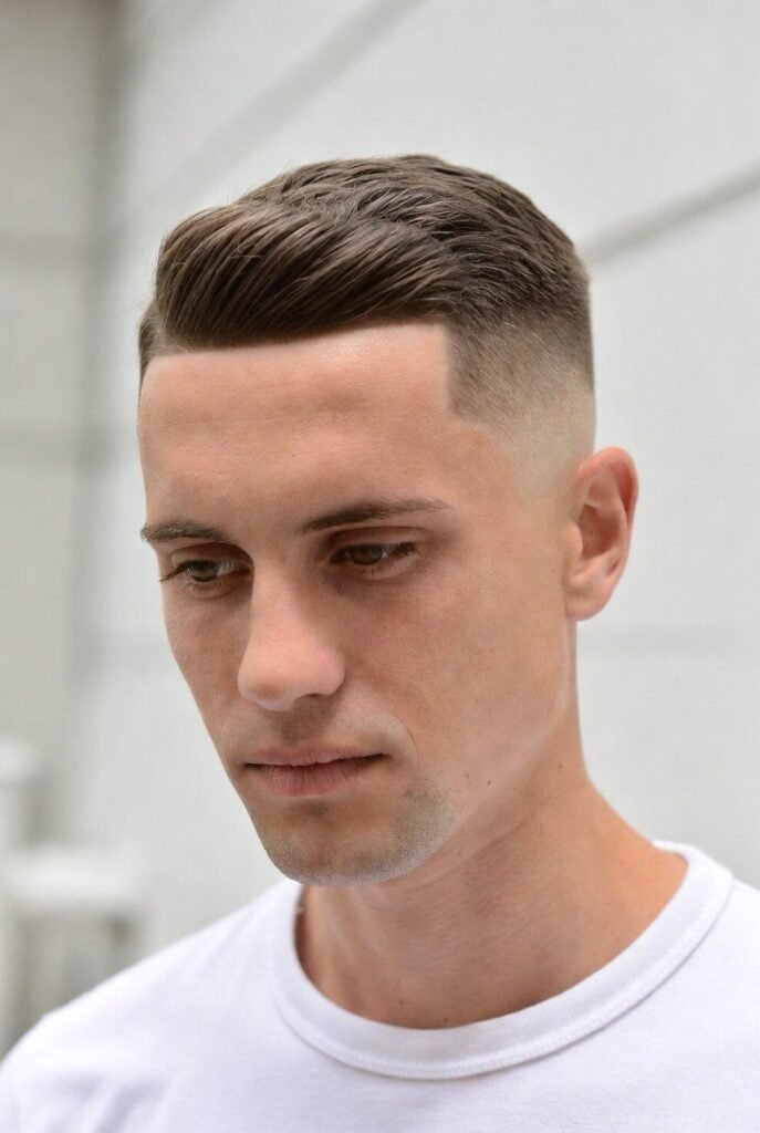Here’s a masterclass in proportion. The high skin fade creates clean lines around the ears and nape, while leaving enough length on top to sweep forward slightly.