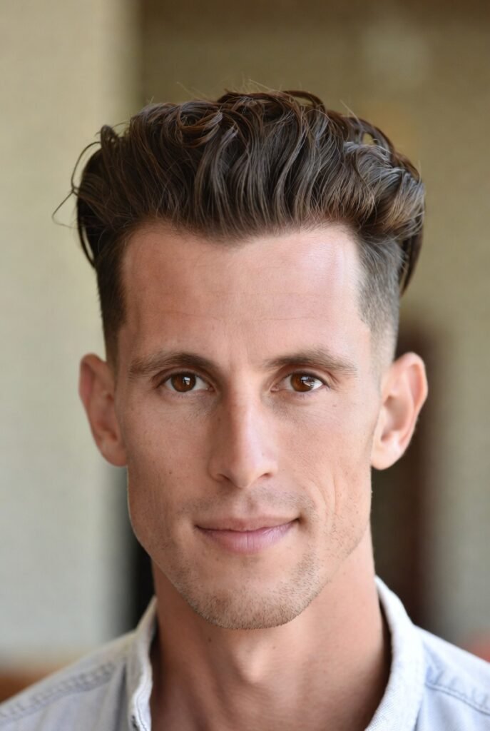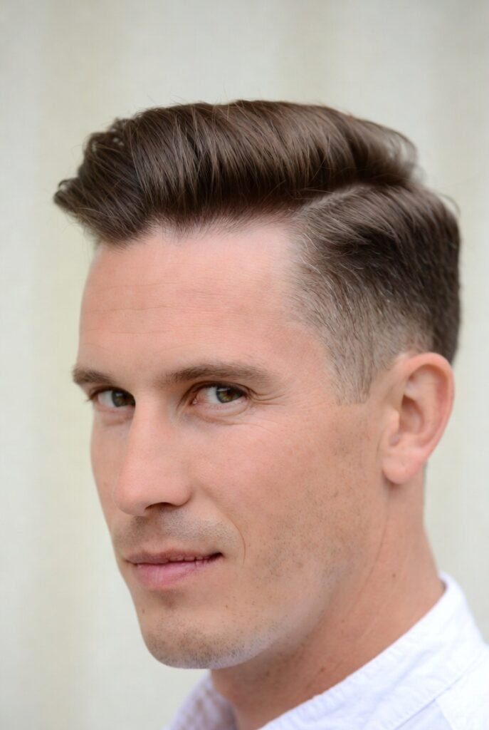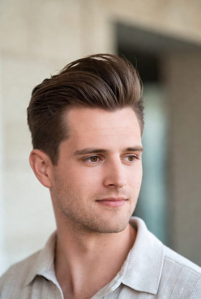 Classic meets contemporary in this refined style. The pompadour adds significant height at the front, shifting focus upward rather than across.