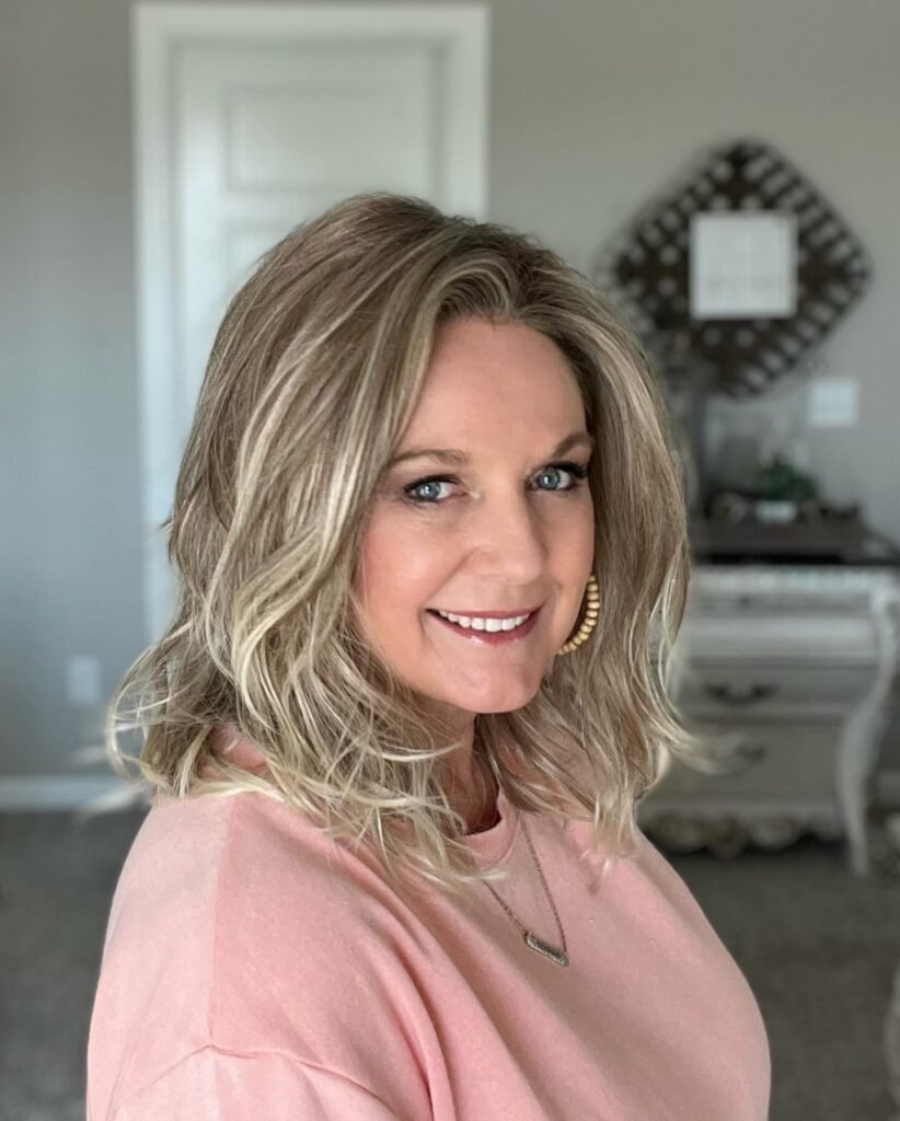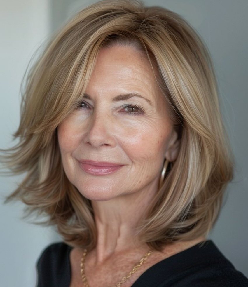 This warm, sun-kissed beachy lob is an absolute dream hairstyle for women over 60 with thin, fine hair who want to look effortlessly radiant and youthful! The shoulder-grazing length hits the perfect sweet spot — long enough for gorgeous movement yet short enough that fine hair doesn’t lose its body and volume.