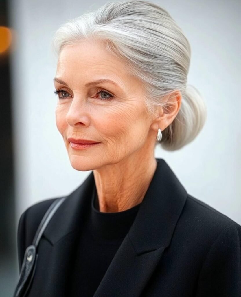 This impossibly chic sleek chignon is the ultimate sophisticated updo for women over 60 with thin, fine hair. What makes this style truly genius is how the smooth, swept-back technique actually works in fine hair’s favor — the sleekness creates a polished, intentional look rather than exposing thinness.
