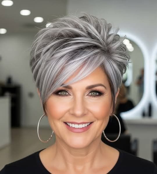 This dramatically voluminous gray pixie with sweeping side bangs is the ultimate power statement for women over 60 with thin, fine hair who want to turn heads everywhere they go! The spiky, lifted layers on top are masterfully crafted to create jaw-dropping height and volume — transforming fine hair into something bold and utterly spectacular.