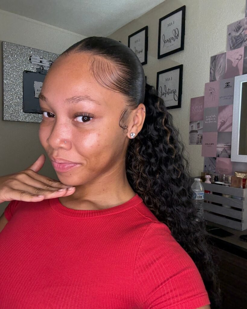 Fresh, youthful, and expertly executed — this slicked-back low ponytail with curly textured ends is a go-to style that strikes the perfect balance between polished and personality-filled. The hair is smoothed back tightly from the forehead using edge control, creating a clean, flat surface across the crown and temples that keeps everything neat and face-framing. The real artistry here lies in the beautifully laid edges — delicate swirling patterns traced along the hairline with precision, adding an expressive, signature detail that elevates the entire look with minimal effort.
