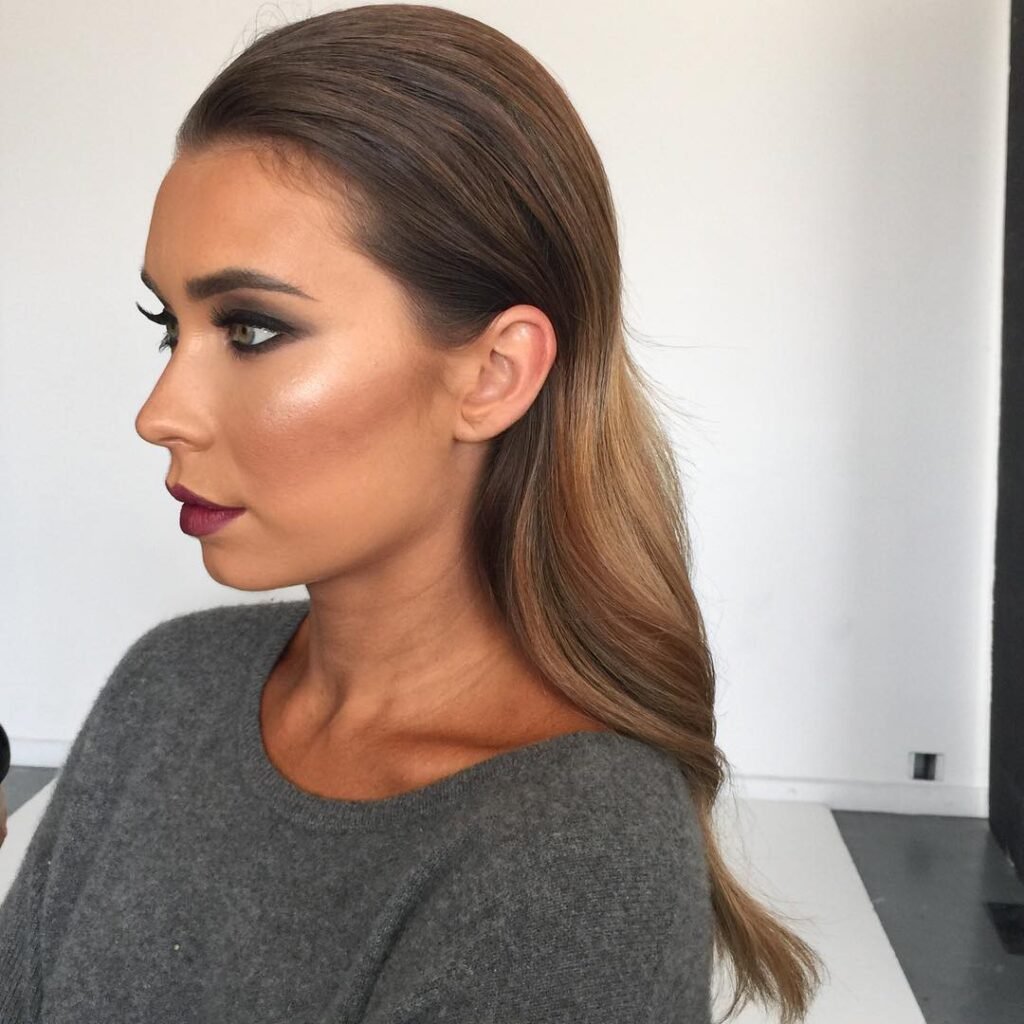 The rich brunette-to-honey balayage coloring is particularly stunning in this style — the darker roots at the slicked crown transitioning gradually into sun-warmed golden ends that drape over the shoulder with gorgeous dimensional warmth. Paired with a bold smoky eye and deep berry lip, this look embodies confident, after-dark glamour at its most effortlessly refined best.
